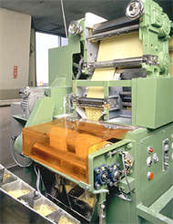 熟成(じゅくせい)の終わっためん帯(たい)を、機械(きかい)で、切っているところです。