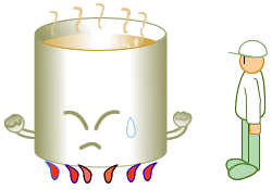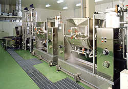 加熱しながらよく混ぜます。 長年(ながねん)の研究により決定された秘伝(ひでん)のレシピにもとづき、衛生的かつ正確(せいかく)に計量(けいりょう)された原料をじっくりと混ぜ合わせながら加熱(かねつ)することで、より美味しくするとともに殺菌もしています