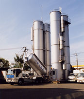ラーメン工場の入りロに、大きな4つのタンクがあります。 ラーメンの原料(げんりょう)になる 小麦粉(こむぎこ)を入れるタンクです。 高さは、15メートルもあるんだよ。