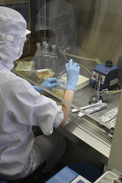 工場を見学していると、「けんきゅう室」とかれているへやがありました。へやのなかには、けんびきょうやいろいろなびんがならんでいます。 けんきゅう室ではどんなしごとをしているのかな?