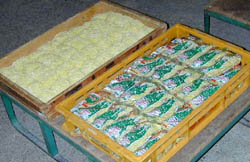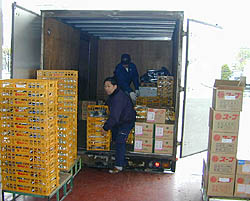 工場で作られたラーメンは、行き先ごとにわけて、大きな冷蔵庫(れいぞうこ)に詰まれています。